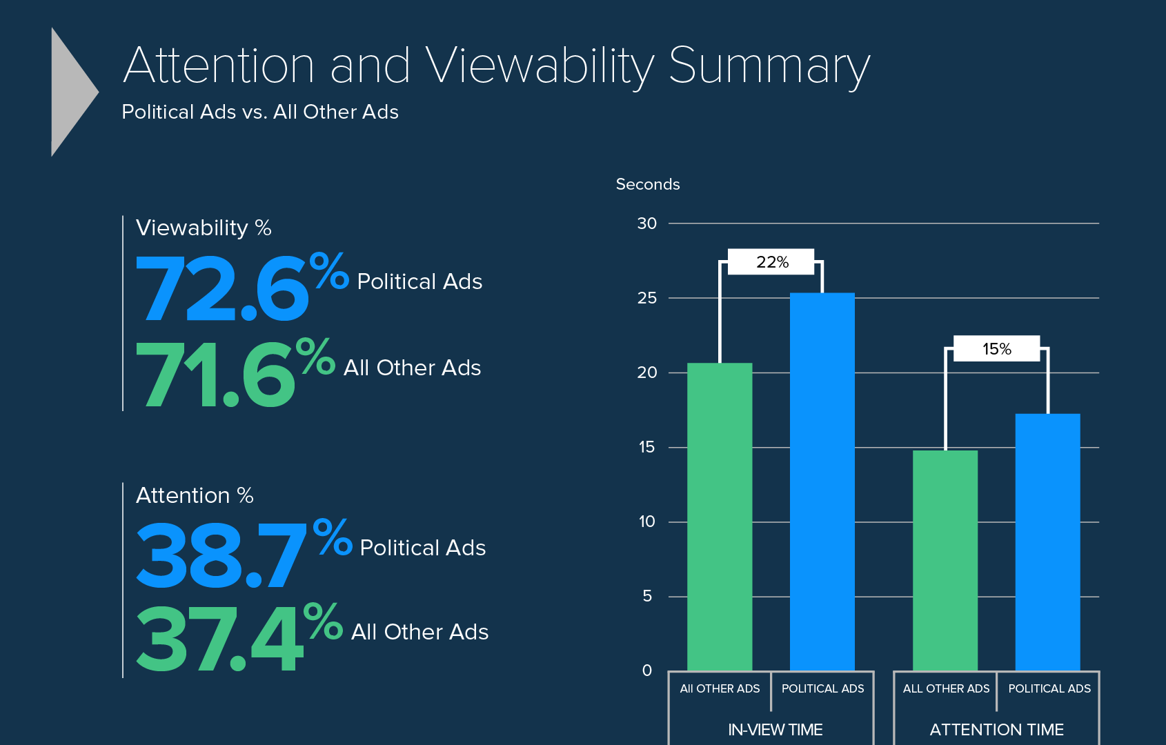 Those in the TV advertising industry know that it can be hard to capture viewer attention with TV advertising. In the period studied, the average TV ad captured attention from 37.4% of viewers for at least 2 seconds, but viewers engaged more with political ads (38.7%). Even a 1% variance in attention is noteworthy.