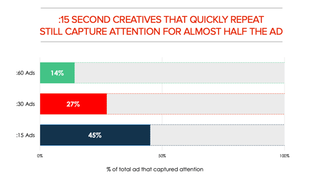 Assuming every second of ad time is priced equally, shorter ads may also deliver better ROI within CTV—especially when ads are shown less than five minutes apart. In this scenario, longer ads see a more dramatic drop-off in attention. Viewers paid attention to 45% of :15-second ads in comparison to 27% of :30-second ads and only 14% of :60-second ads.