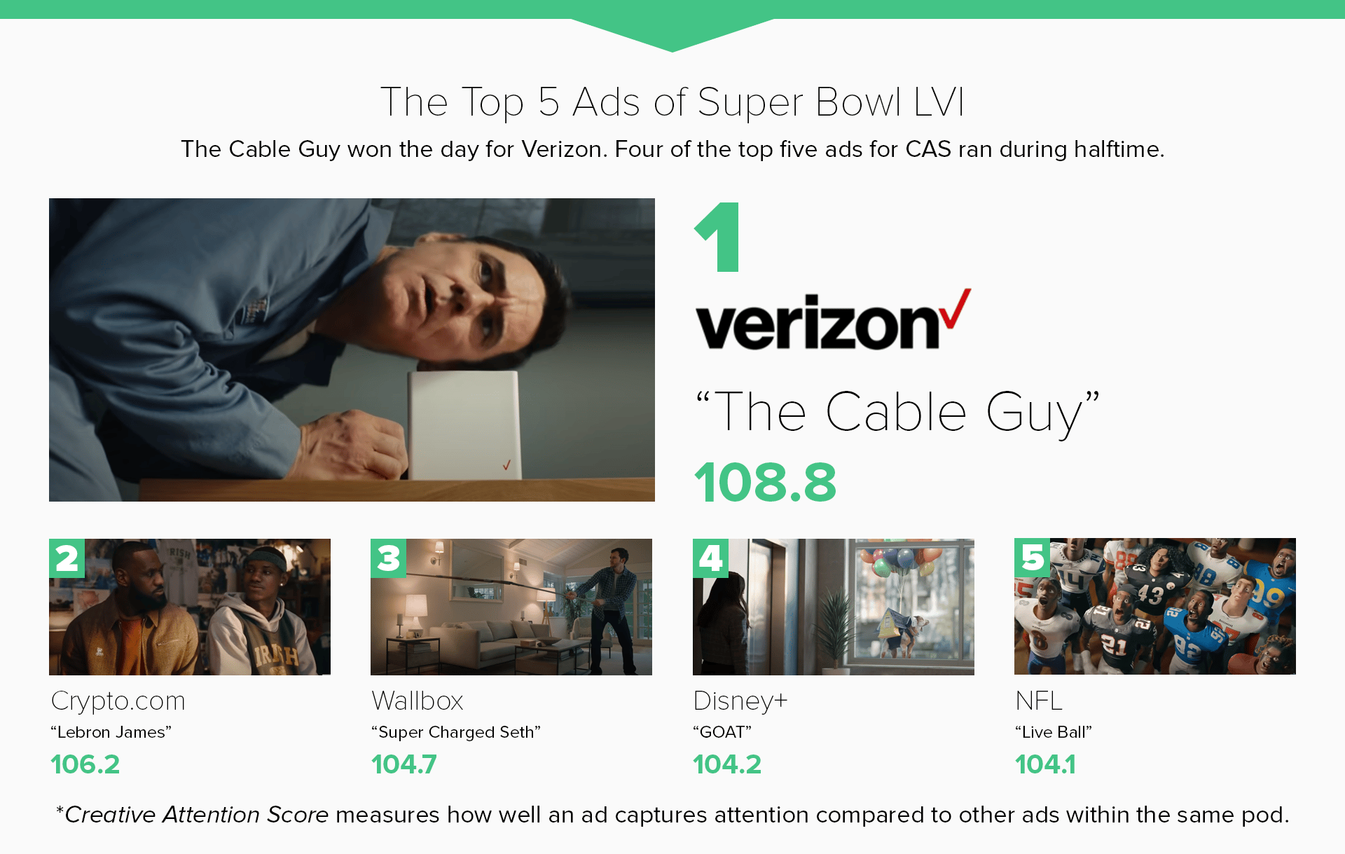 Two themes that dominated the Super Bowl ads this year - throwback movies and TV shows (Verizon - "The Cable Guy"), and cryptocurrency (Crypto.com - Lebron James) - were represented in our list of ads that captured attention best. Wallbox (Super-charges Seth), Disney+ (The GOAT) and the NFL (Live Ball) also make our list. TVision's Creative Attention Score measures how an ad broke through to capture attention compared to other ads within the same pod.