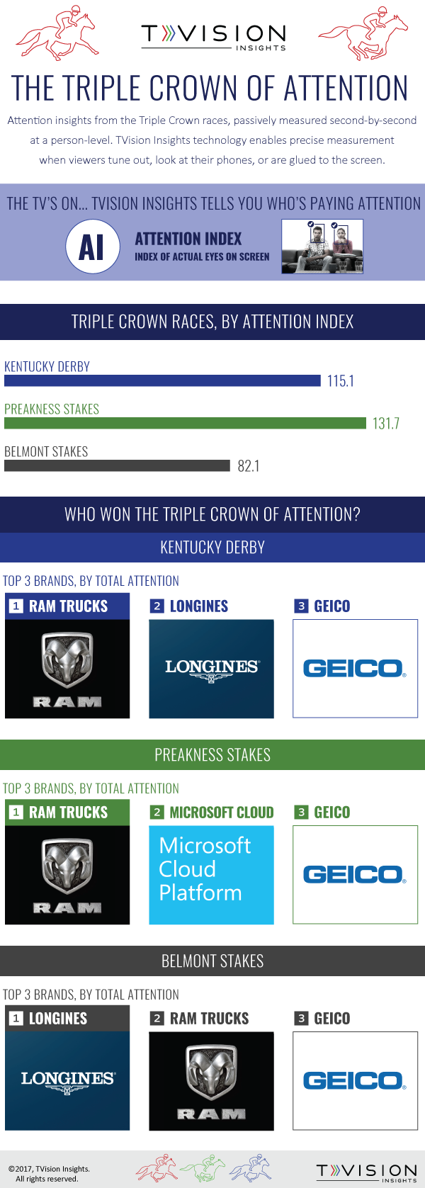 While a horse did not win the Triple Crown this year, we sought to find out if an advertiser had won the Triple Crown of Attention. We looked at the total attentive seconds captured by each brand during each race: the Kentucky Derby, Preakness Stakes, and Belmont Stakes. Take a look at the results below.